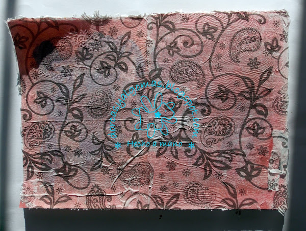 Sigo trabajando un poco más el fondo y utilizo un sello de escritura con tinta marrón.