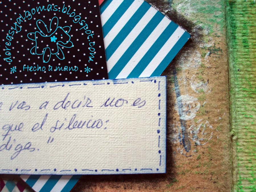 Ya está listo el fondo, voy con la colocación de los distintos elementos decorativos y el texto. Para ello antes de pegar, los coloco sobre la página, buscando el lugar idóneo.