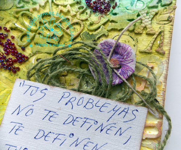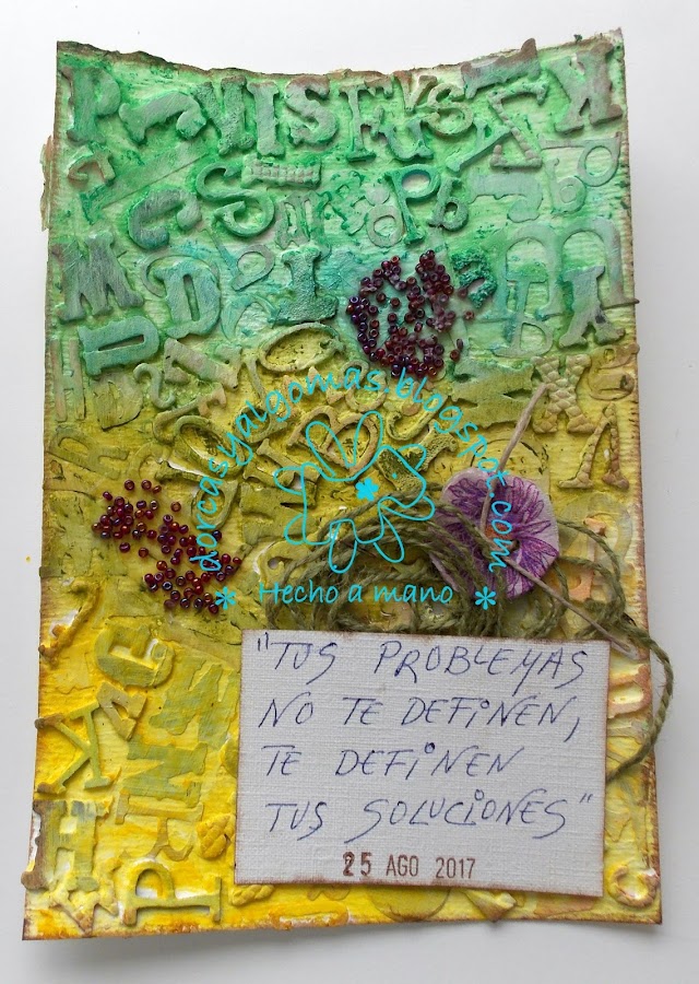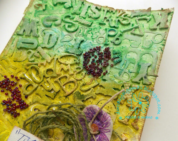 Listo el fondo. Vamos con la decoración. Unos abalorios pegados con gel médium (es una manera de ir aprovechando este tipo de material que tengo mucho y no lo utilizaba), el texto, un poco de bramante o cuerda de color verde y un detallito. También entinto todos los bordes de la página con tinta Vintage Odissey de Distress.
