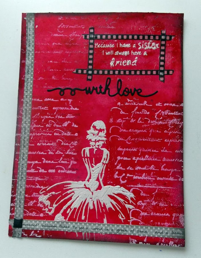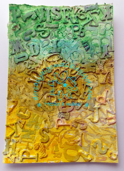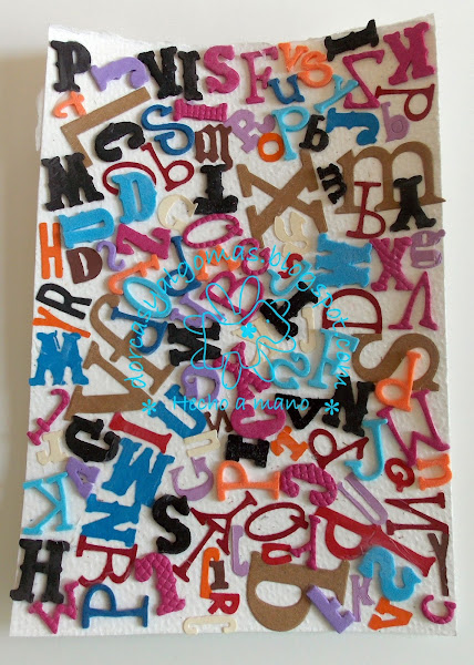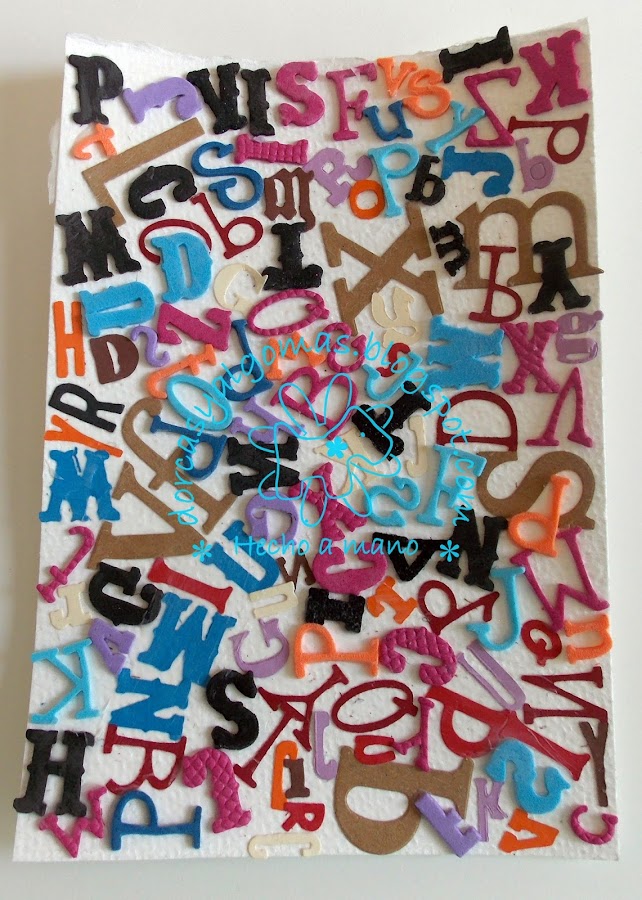 Vamos con el paso a paso, lo primero que he hecho es pegar restos de abecedarios que tengo en una caja y que para este fondo me han venido de perlas. Los he pegado con gel médium. A continuación, doy una capa de gel médium sobre toda la página para sellar bien todas las letras. Dejo secar.