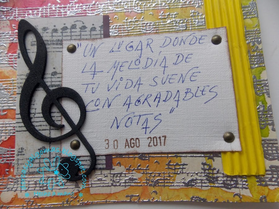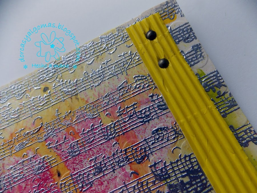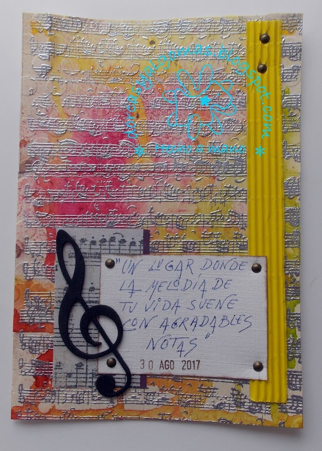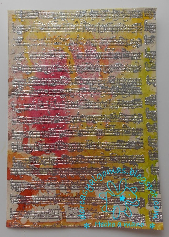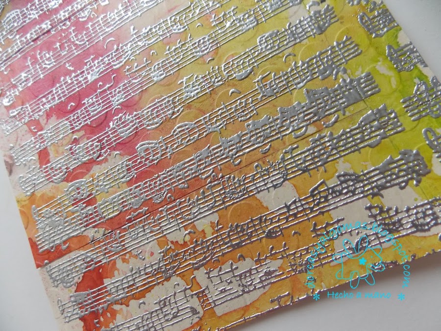 Dejo secar y a continuación realizo el embossing en caliente con polvos de embossar plateados y un sello de partitura musical.