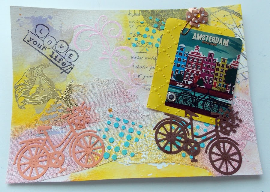 Se trata de un intercambio de páginas de Art Journal con el tema "Un lugar" y como requisito hay que utilizar la técnica de "Embossing".