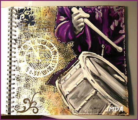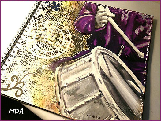 Para hacerla utilicé una imagen del pintor Alex Mirasol que alteré un poco con acrílicos. Para el fondo use un stencil, pintura y tintas. Las decoraciones son troquelados también entintados ligeramente.