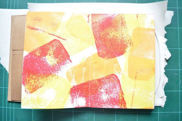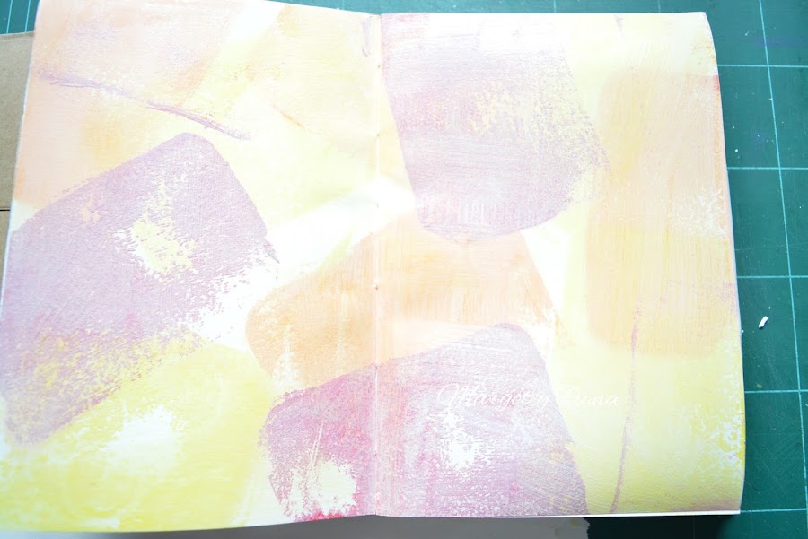 Comenzamos este trabajo jugando un poco con un Gelli Plate y pintura acrílica en distintos tonos ( Dylusions). Estampamos y dejamos secar.