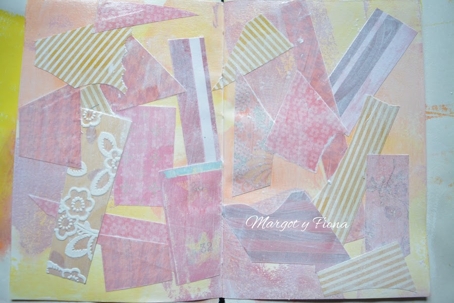 Los pagamos sobre la superficie del trabajo dejando algunos huecos libres. En este caso he usado Matte Medium Liquitex