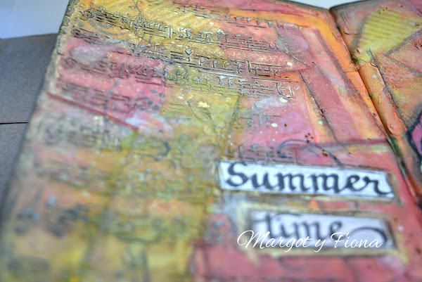 Para esta ocasión la página de art journal es de un colorido cálido donde predominan los rojos, naranjas y amarillos, sin olvidarnos de los dorados tan difíciles de fotografiar.