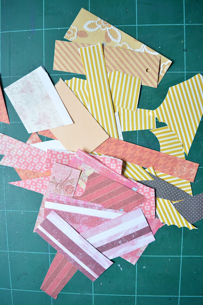 Ahora buscamos en nuestra carpeta de retales de papel, algunos que nos puedan ir bien con las tonalidades y hacemos varios trozos. Si pueden ser de distintas texturas, mucho mejor.