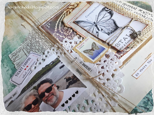 Un fondo sencillo, con gesso, inktense y pasta de craquelado. Reciclé una tarjeta para usar como base y de la que podéis ver el paso a paso en el blog de Todo Stencil. Un poco de esto y aquello y el journaling para acabar una página con mucho significado.