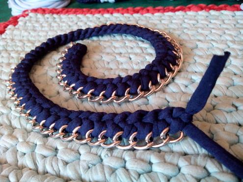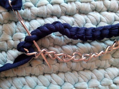 Al finalizar nuestra cadeneta cogemos una aguja lanera e introducimos nuestra hebra de trapillo pasándola por la cadena y los agujeros de cada punto, vigilando que no se nos gire la cadena para que quede bien puesta.