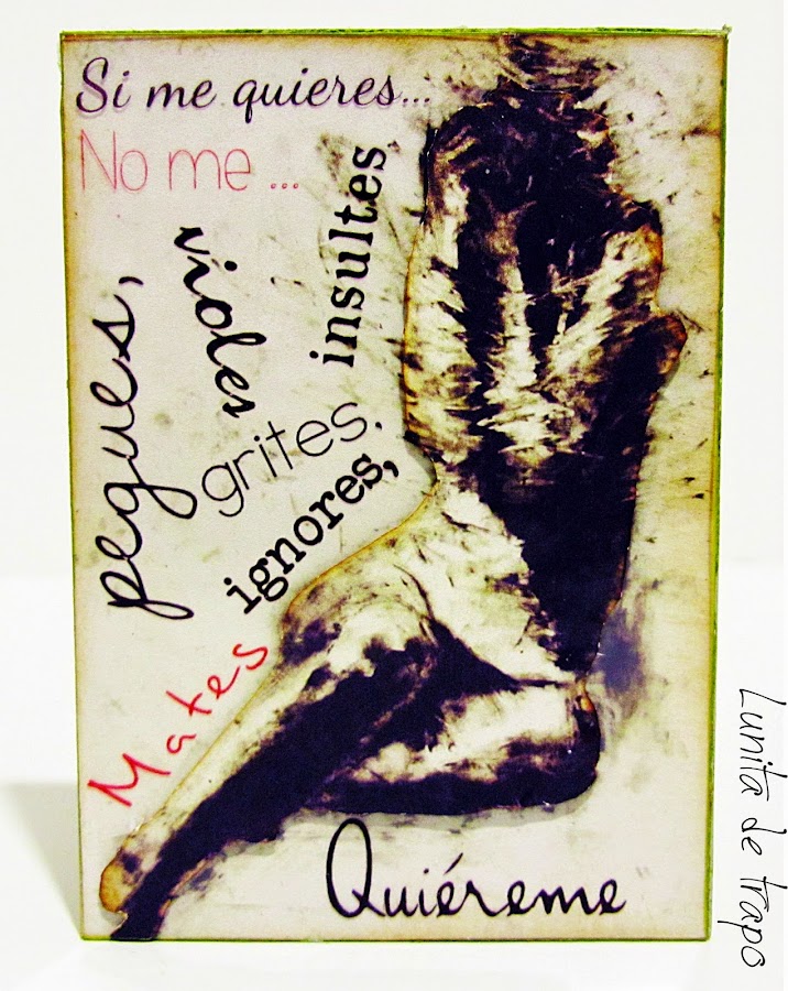 Este mes además una gran persona nos pidió al grupo de ATC olé que si podíamos hacerle unos atc sobre Violencia de género, para una exposición que quiere hacer en Sevilla este invierno, he de decir que me costó un poco realizarlos ya que este tipo de temas no me motivan para crear pero al final he hecho estos dos tarjetas, realizadas con las ilustraciones de Michael Shapcott y de Clara Lieu así han quedado.