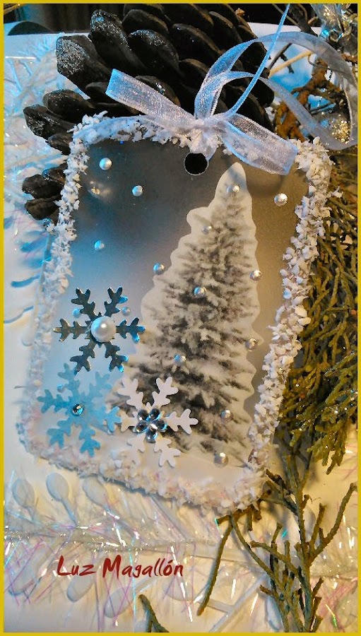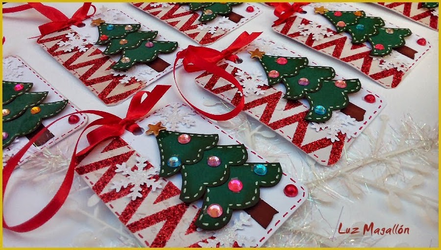 Sobre una base mitad blanca y mitad en papel decorado con embossing en rojo he colocado una árbol de navidad formado por cuatro piezas y que yo misma he diseñado, algunos adornos una cinta roja para colgar (elemento obligatorio en el inter) y aquí está la primera serie.