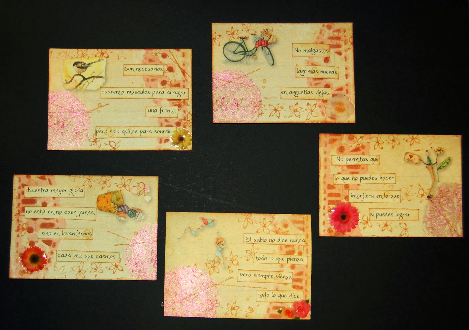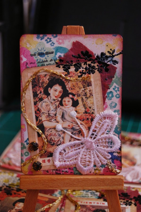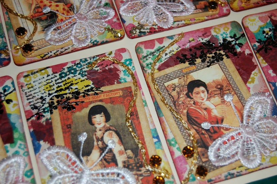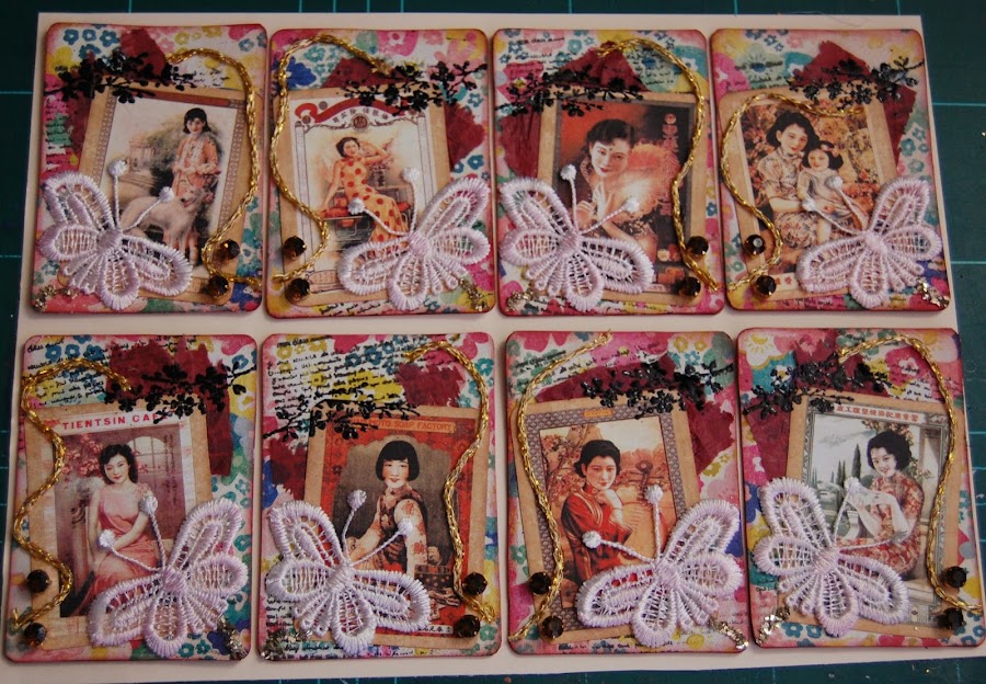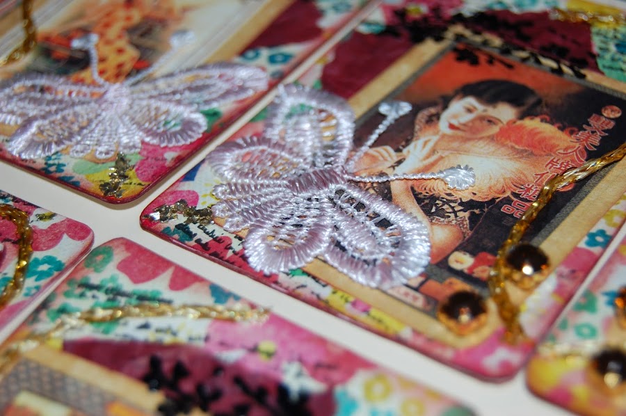 Una vez más os enseño mis últimos ATC, dedicados a las mariposas, no era la idea original pero empecé que si flor por aquí mariposa por allá y dio este resultado, como siempre las fotos no muestran realmente como son ni sus texturas pero aún así creo que han quedado bien, ahora espero que las afortunadas que se los lleven a su casa les gusten tanto como a mi. Gracias por leerme. Yoli