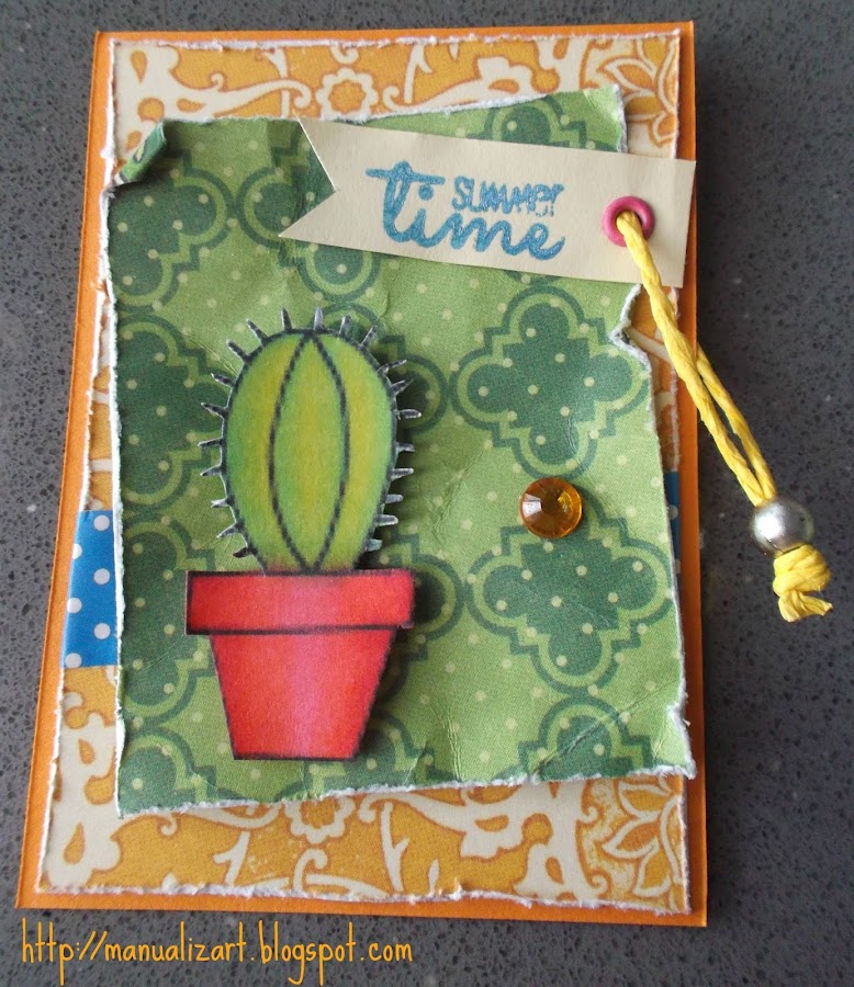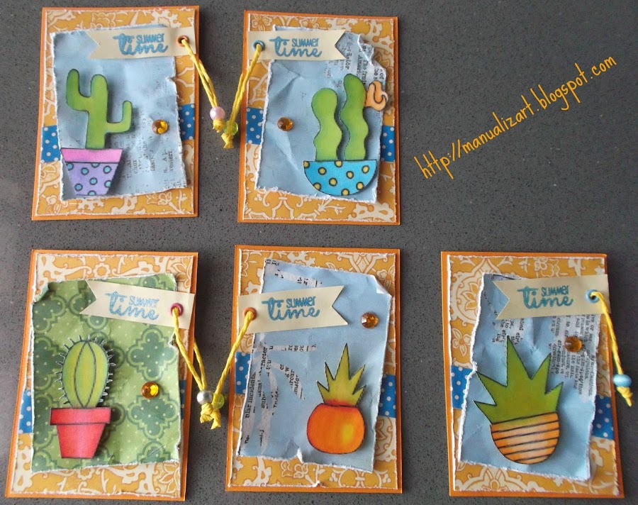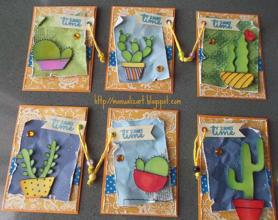 Las imágenes, los cactus, los imprimí en cartulina normal, pero la tinta de los rotuladores se absorbía demasiado para mi gusto, hasta el punto de mezclarse en lugares en los que yo no quería. Así que, para la próxima, probaré con estampaciones con mi tinta Memento, que me he comprado para ello. ¡Ya os enseñaré qué sale!
