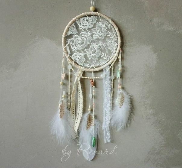 Comenzamos por haciéndonos una plantilla con la base circular para cortar la tela de encaje, adornaremos el marco circular con hilo y cosemos la tela de encaje en el centro. En el extremo superior del marco haremos un bucle para poder colgar, y la parte inferior la decoraremos con las plumas y accesorios de los que dispongamos.