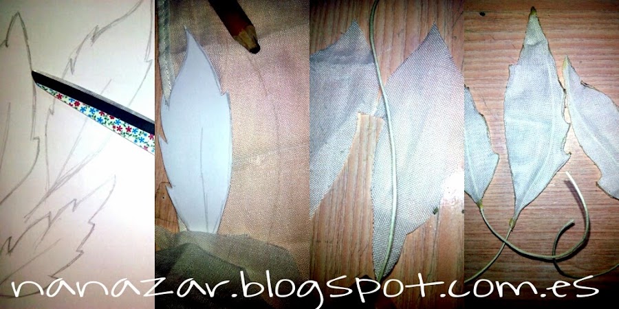 Y el toque final, son las plumas. Yo las he hecho de una tela muy fina blanca. Primero haremos una plantilla con los diferentes tipos y tamaños de pluma que queramos hacer (Las mías parecen hojas) Luego recortamos dos veces la misma por cada pluma que queramos hacer, pegamos en los dos extremos el hijo encerado blanco, dejando un rabo en la parte de debajo de la pluma. Y quemamos los bordes de la tela uniendo las dos capas.