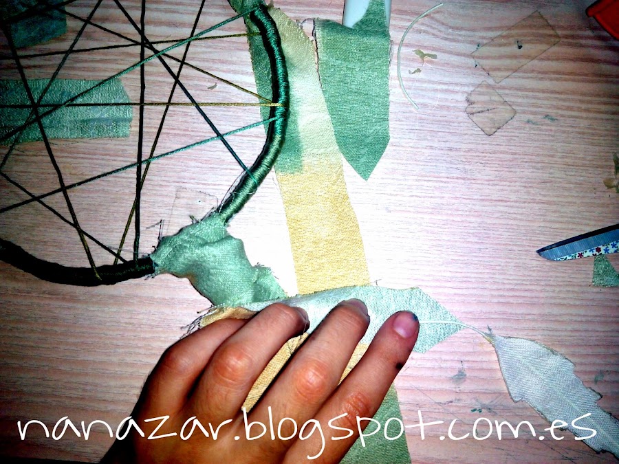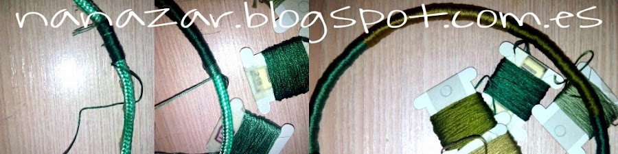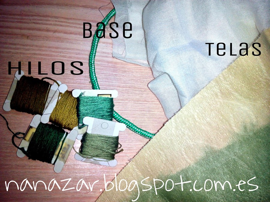 Tras más de 20 minutos combinando telas e hilos, al final me decidí por esta combinación de verdes, marrones y amarillo palo. El hilo que empleé finalmente fue el hilo mouliné, porque tiene seis hebras y al ser más gordo me costó muy poco tiempo ir enrollándolo en la base que había hecho antes.
