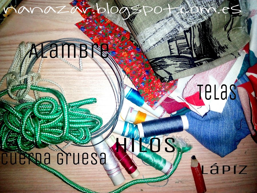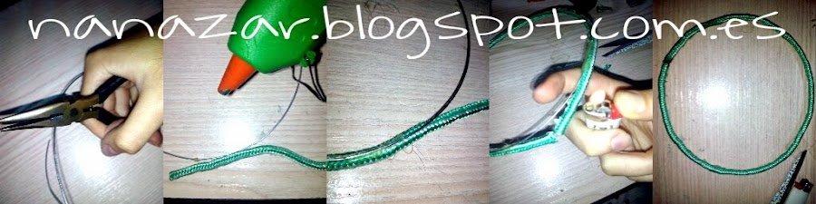 Lo bueno de crearlo tú mismo, es que podemos hacerlo de la medida que queramos. Corta la longitud del alambre que quieras y pega con silicona caliente o cualquier otro adhesivo una cuerda gruesa (yo he utilizado la de tender la ropa) Los extremos de este tipo de cuerda, con un mechero se pueden quemar y unir, ya que es pegajoso. (Si tu cuerda no hace esta función, pégala con cualquier pegamento normal)