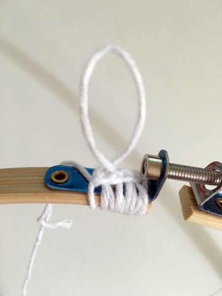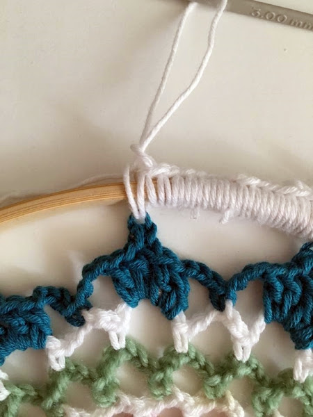 La parte más trabajosa es unir el círculo que hemos hecho al bastidor o soporte circular. Yo lo hago haciendo una vuelta de punto bajo, y donde pida, engancho el círculo. Os he hecho una secuencia de fotos para que veáis como se hace. Hay que ir envolviendo el soporte con el hilo.
