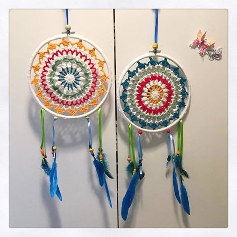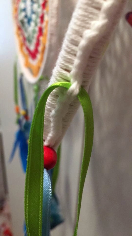 Para que las cintas no se deshaga, podéis quemar ligeramente los extremos. Finalmente atamos las plumas y ya tenemos listos nuestros atrapasueños.