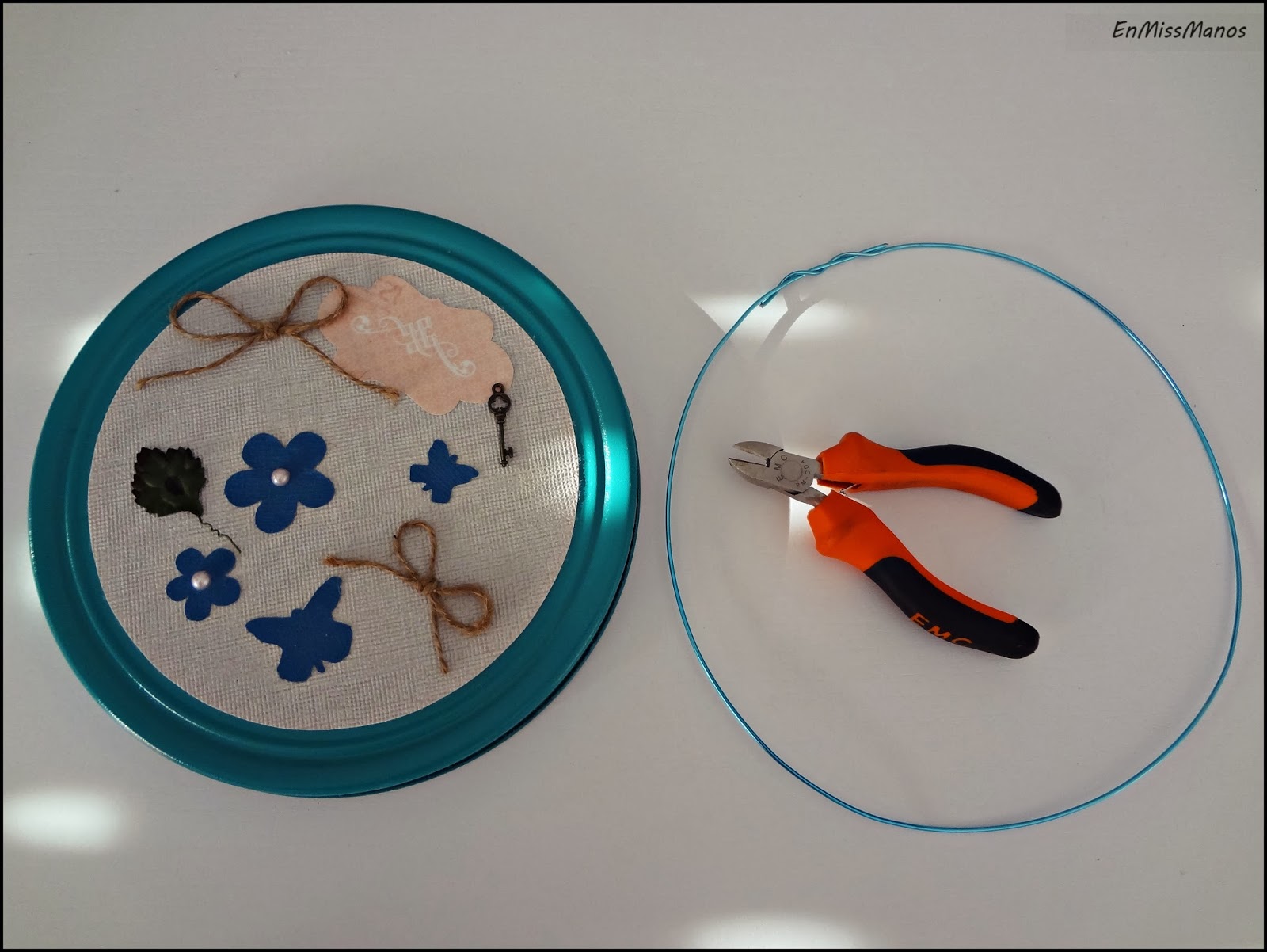 Hacemos con alambre un círculo del tamaño que queramos. Yo lo hice con la tapa de una caja de galletas.