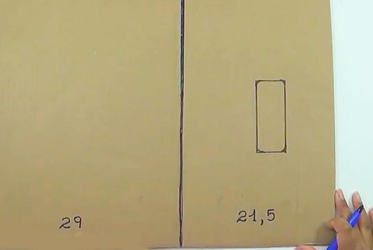 Cortar un rectángulo de cartón de 54 cm x 35 cm. Marcar los 54 cm a los: 3,5 cm, 29 cm y 21,5 cm.