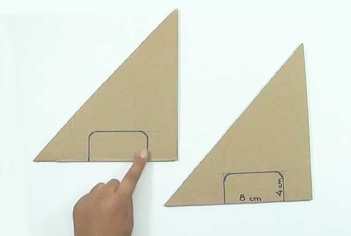 Cortar en los triángulos, en la parte mas corta, una ranura en cada uno de 8 x 4 cm, puedes redonderar las esquinas pra que quede más estilizado.