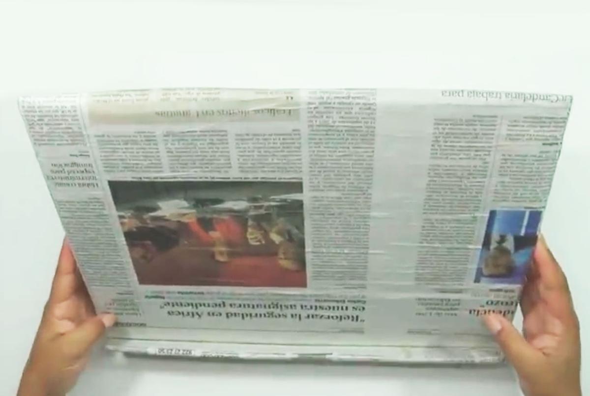 Cuando el doblez haya secado, pegar papel por todo el atril para reforzarlo, puedes usar la técnica cartapesta (Trozos de papel periódico con cola blanca).