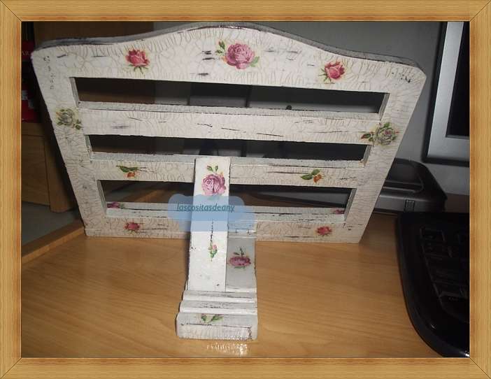 termine el atril para el codice,lo he pintado de marron,y despues le he pasado la vela,pintado de blanco,y lijar para que salga el marron de debajo,le puse unas flores pequeñitas recortadas a mano,y craquelar con alkil y vallejo,y la patina betun de judea con cera,me gusta mucho como ha quedado