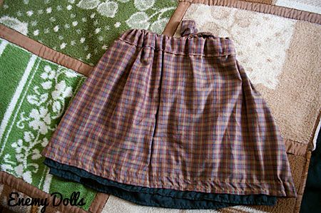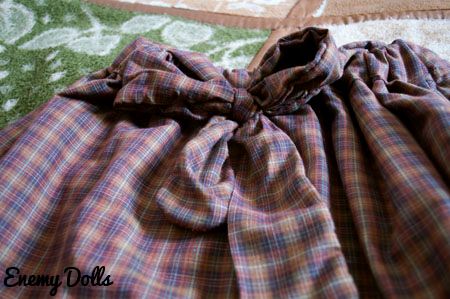 Por detrás le puse un lazo. Uno de los errores que no entiendo es por qué la tela negra sobresale más por detrás: corté el patrón recto, monté todas las piezas rectas en la cintura, y cuando estiro la falda, desaparece. pero al ponerla y al tirarla sobre la cama, aparece de nuevo. Me tiene intrigada. Estos cuadros no me preocupé de casarlos: de todas maneras, al estar fruncidos, no se nota.