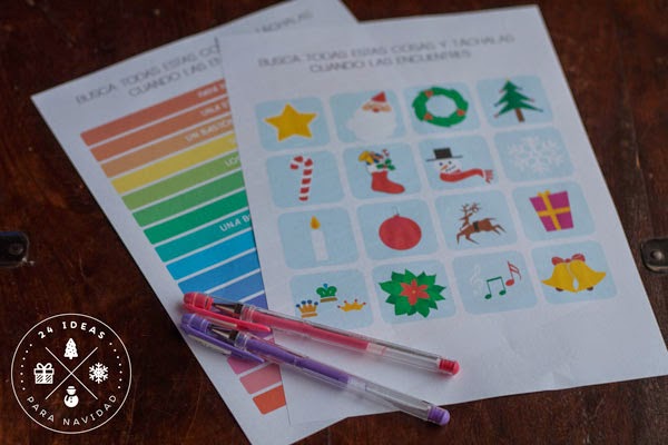 Así que cuando nos sentamos a pensar en ideas para este proyecto, una de las que se me ocurrió casi instantáneamente fue trasladar ese juego que los pompones adoran y crear una lista de objetos y símbolos navideños que fueran fácilmente reconocibles por los más pequeños. Lo he diseñado como buenamente he podido y lo podéis descargar en dos versiones: una con dibujos, para los niños que no leen, y otra con letras para los mayores.