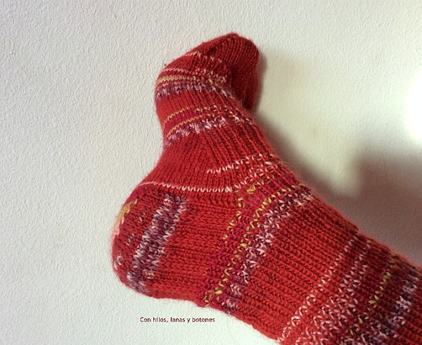 Son mis segundos calcetines empezando por arriba y terminando en la punta. Si queréis aprender la técnica para tejer calcetines de este tipo tenéis las instrucciones en español en la web de Ana Conde, Socks & Co. y un tutorial también en español más detallado en el blog diario visual de una tejedora de Siona. Hace un tiempo se embarcó en nuevos retos y nuevos proyectos y tuvo que tomar la difícil decisión de cerrar el blog. Lo cerró, pero no lo borró, así que podemos seguir aprendiendo un montón con sus explicaciones que son geniales. Están explicados para tejer con 5 agujas, pero se pueden hacer también con aguja circular.