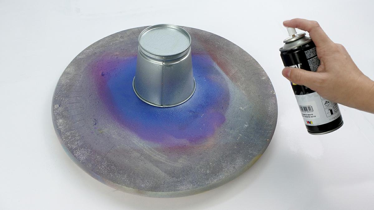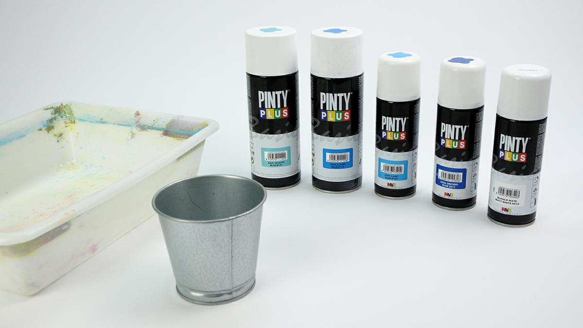 En nuestro caso, al ser un cubo galvanizado, previamente lo hemos pintado con spray blanco para que después el efecto sea más intenso.