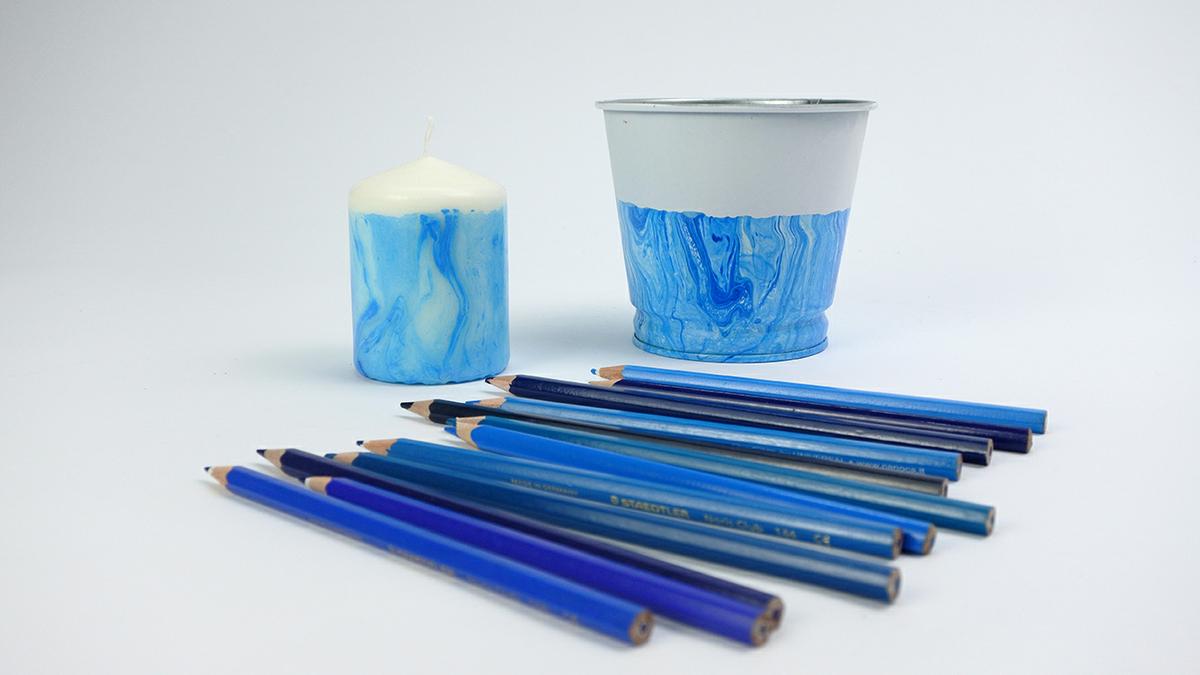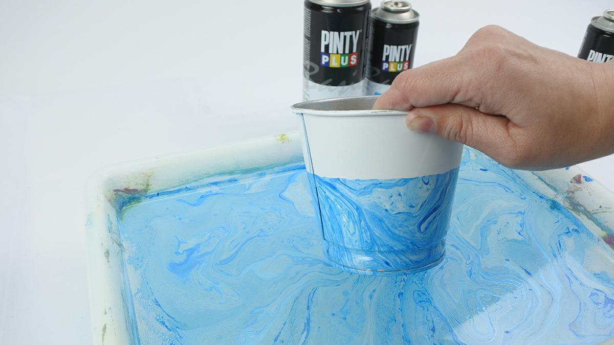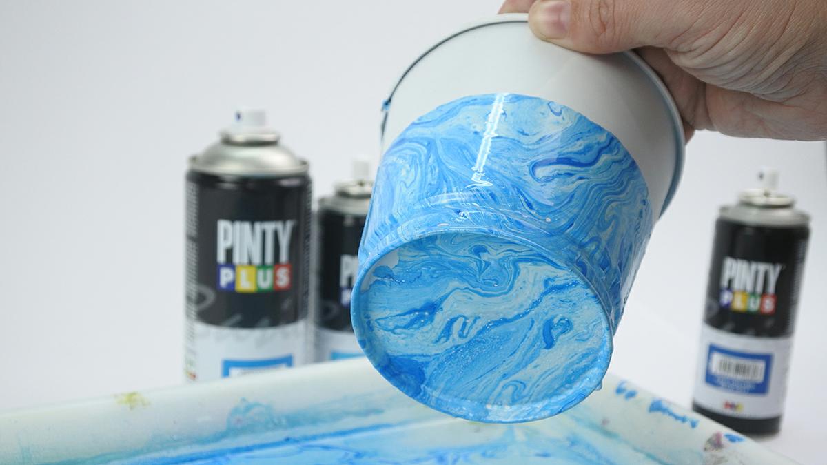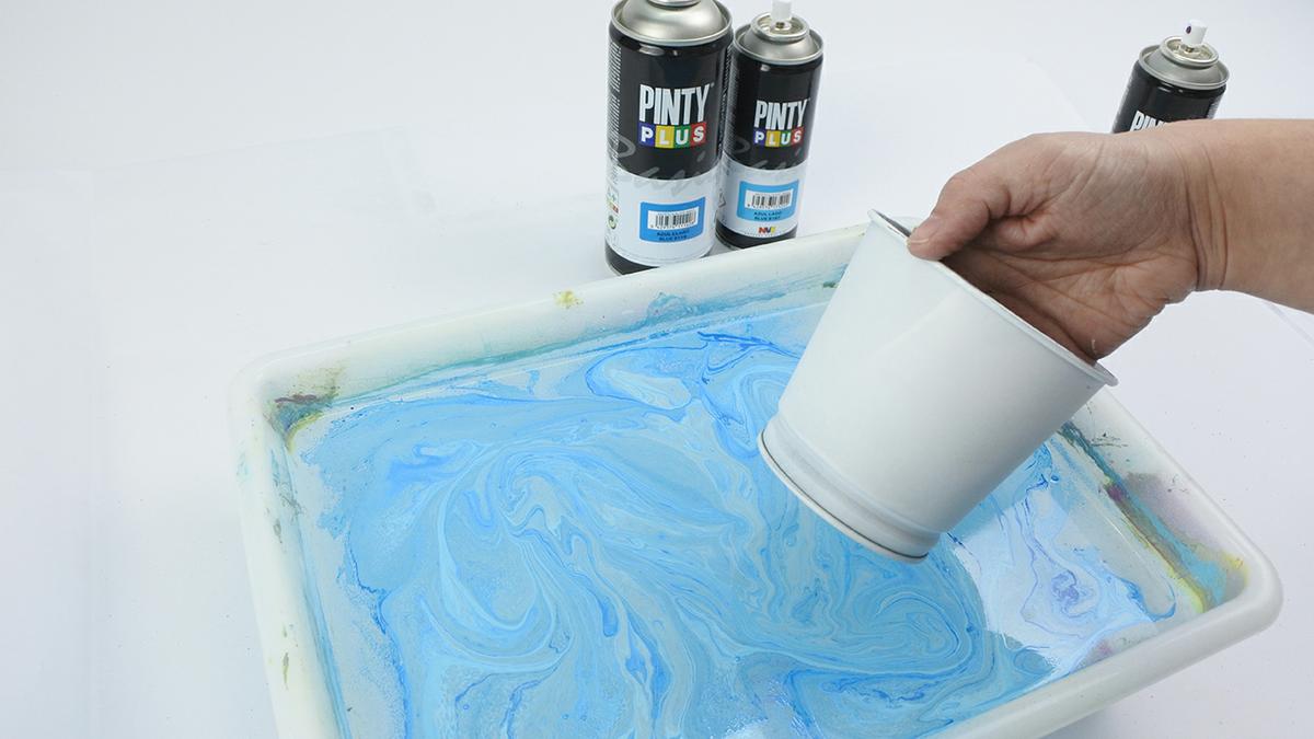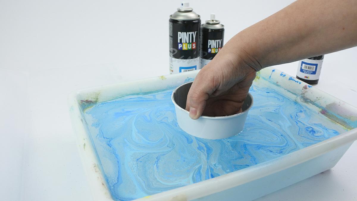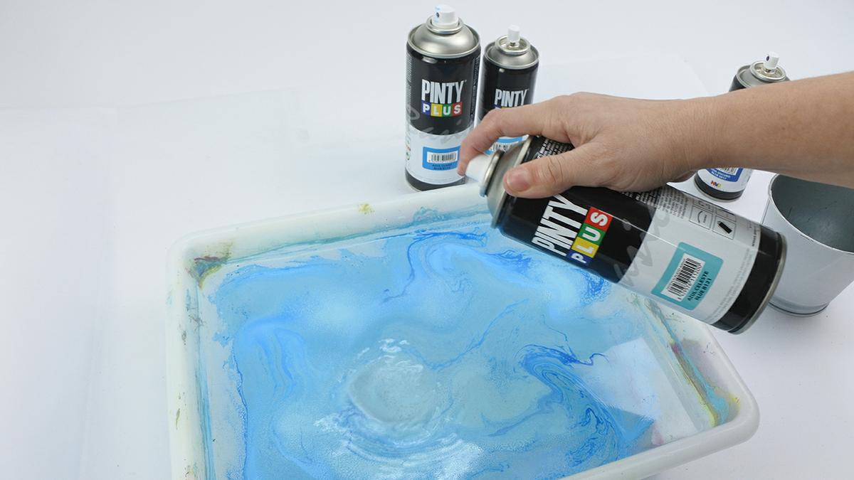 Tan solo necesitamos una cubeta con agua, sprays de diferentes colores, y el objeto que deseemos marmolar.
