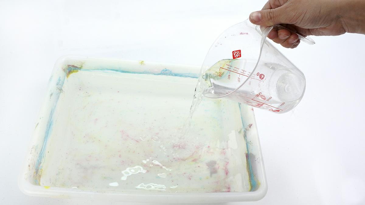 Sí, utilizamos la bandeja giratoria de Ikea para pintar Una vez seca esta capa de pintura nos ponemos manos a la obra. El primer paso, llenar la cubeta de agua.
