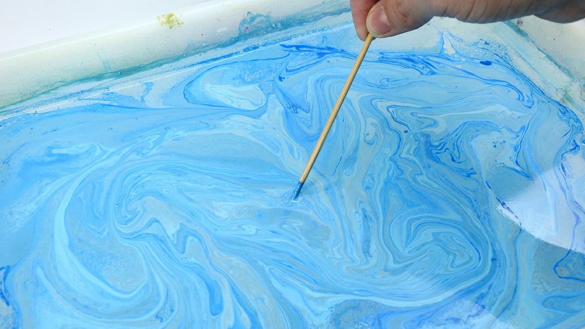 Para conseguir diferentes efectos podéis remover el agua haciendo así que los diferentes colores de pintura se mezclen, de este modo, se consigue mayor efecto marmolado.