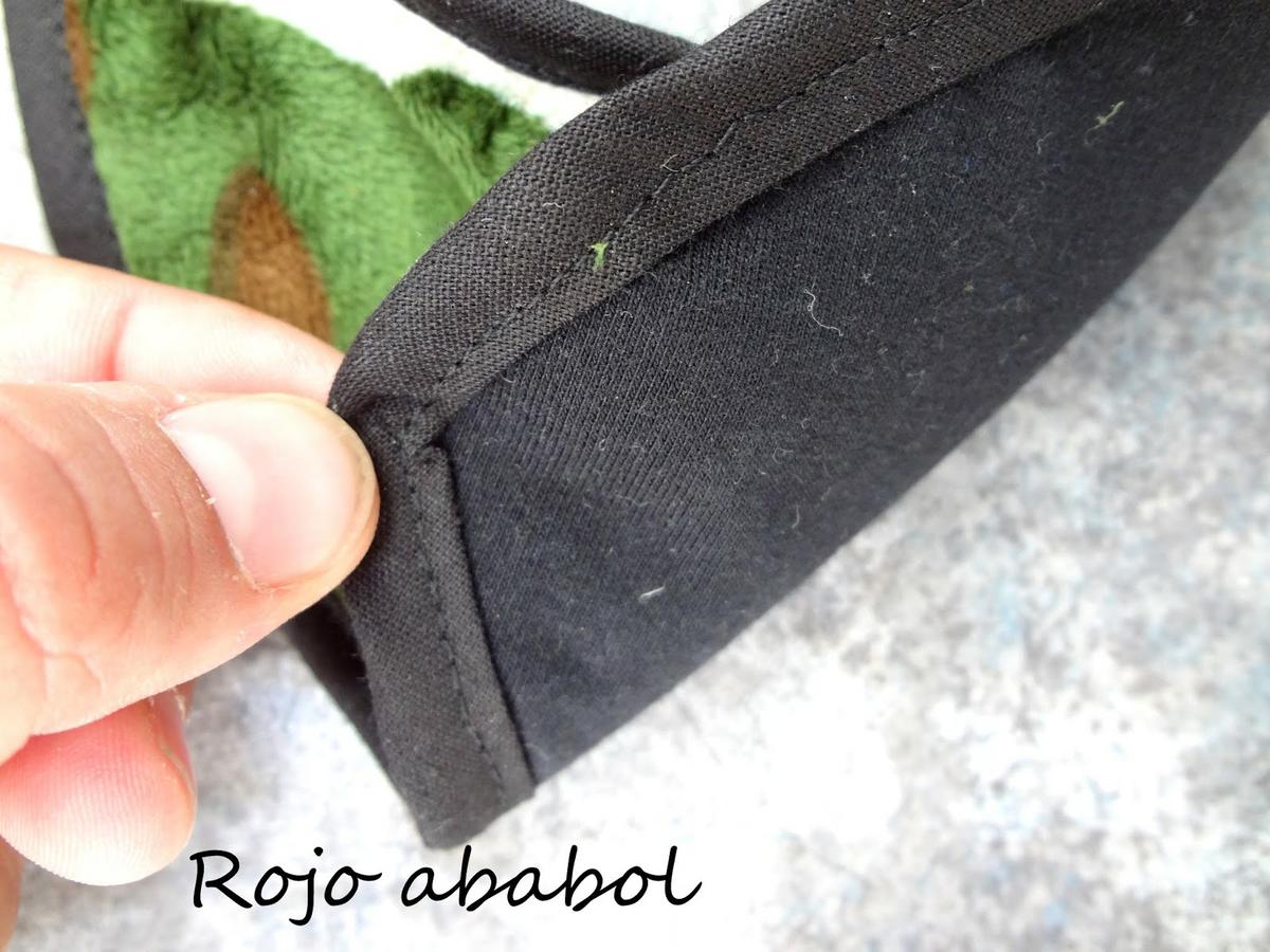 Tela de minky estampada en el exterior y camiseta negra reciclada en el interior. Caras buenas hacia fuera, costura para sujetar y bies negro para el contorno. Sencillito y resultón :)