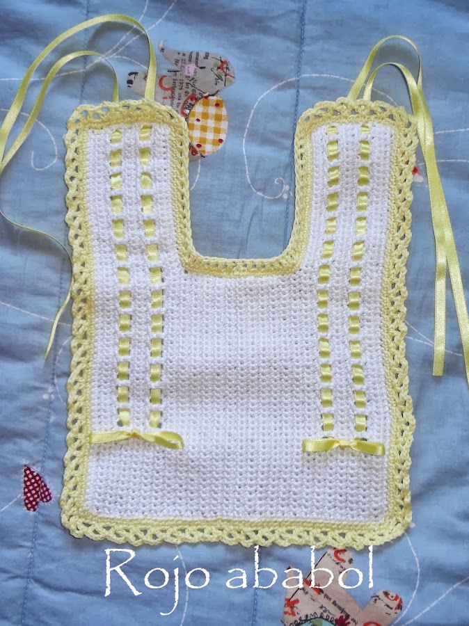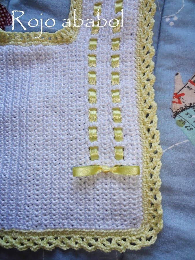 Dos vueltas entrelazando puntos altos en el contorno del babero. El contraste suave del amarillo con el blanco queda muy bonito verdad?