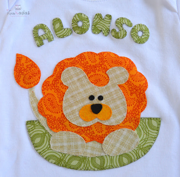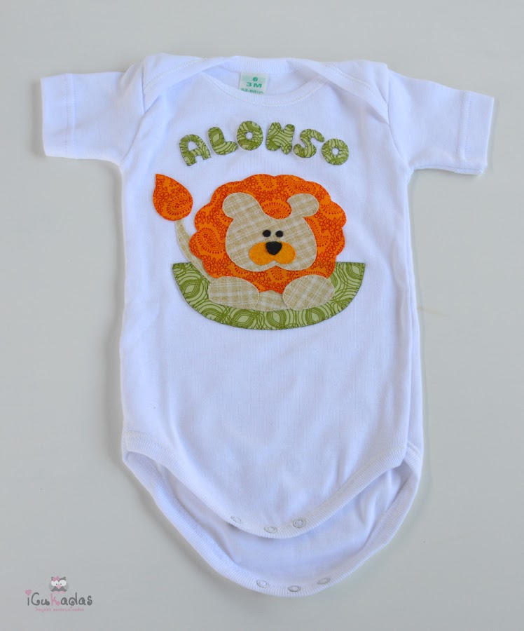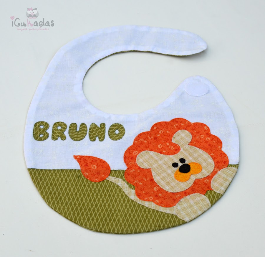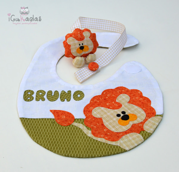 El modelo del león sigue manteniendo los mismos colores vivos, el mismo leoncillo con mirada tierna, y la posibilidad de personalizarlo, pero cambia la forma del babero, como el del búho, que podéis ver AQUÍ.