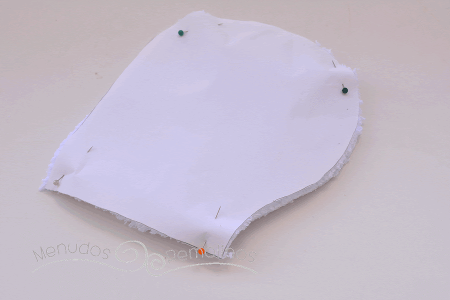 Comenzamos doblando la tela de rizo y poniendo el patrón, (parte recta), en el doblez de la tela. Sujetamos con alfileres y cortamos.