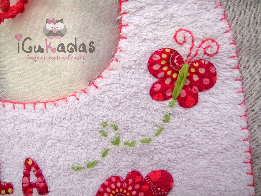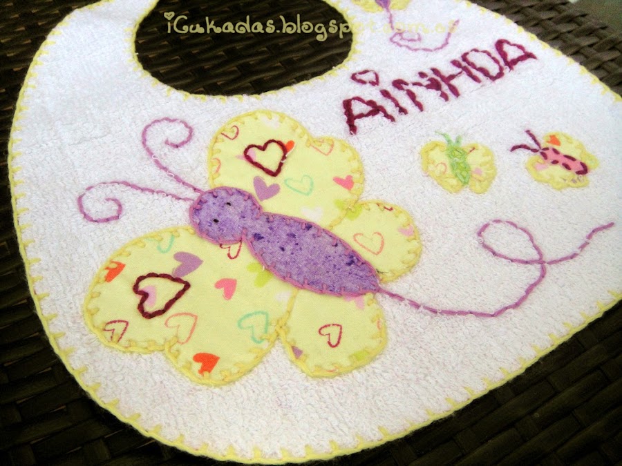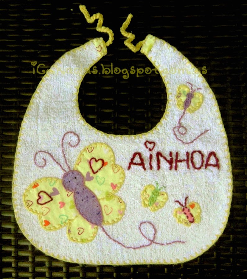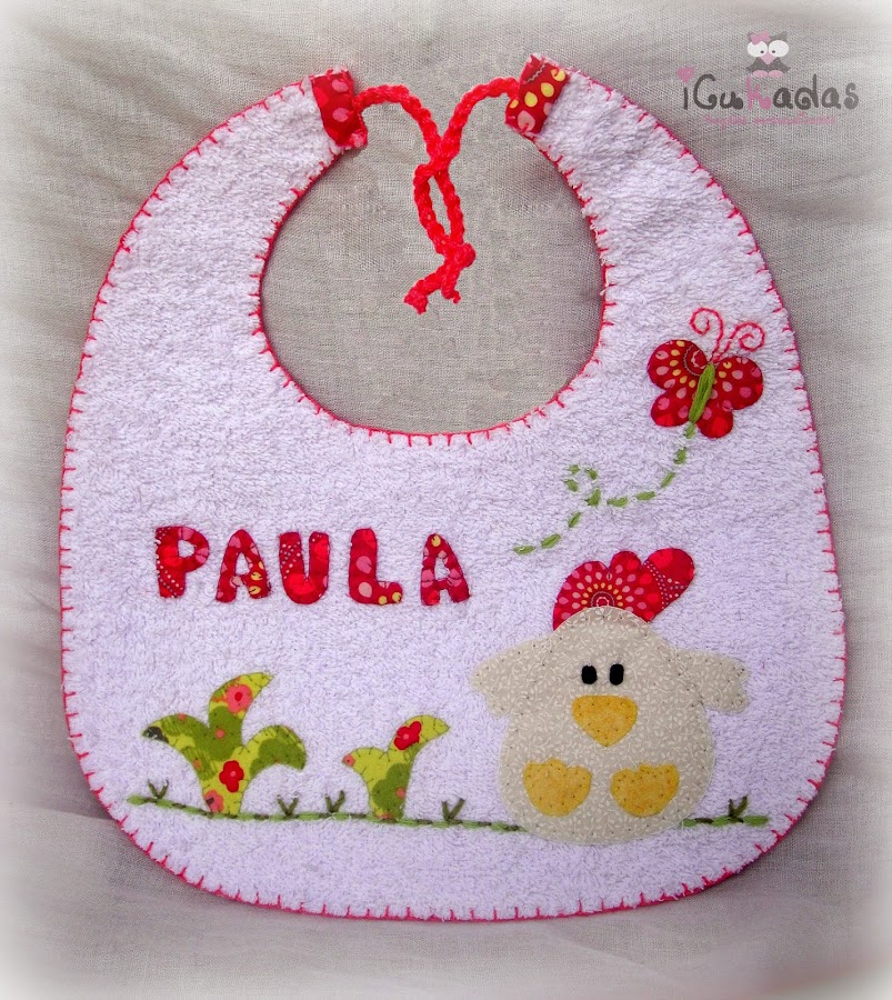 Y para terminar con los baberos de niñas, hice una versión del babero del pollito de niño, que podéis ver AQUÍ, ahora no se cual me gusta más.