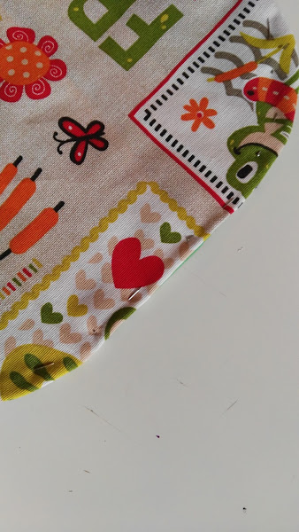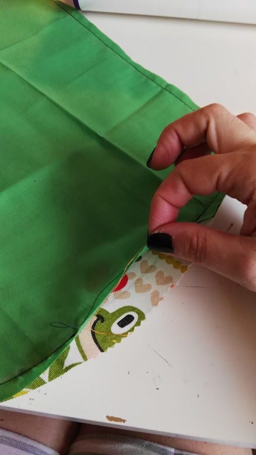 Esta vez he usado los restos de las telas que me quedaban del guarda pañales que hice cuando nació el pequeño. Una loneta de ranitas súper graciosa. Y para la parte de atrás, una tela de sábana verde que jamás llegué a usar, ya que me arriesgaba a que el niño se volviera epiléptico por el color.
