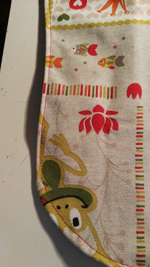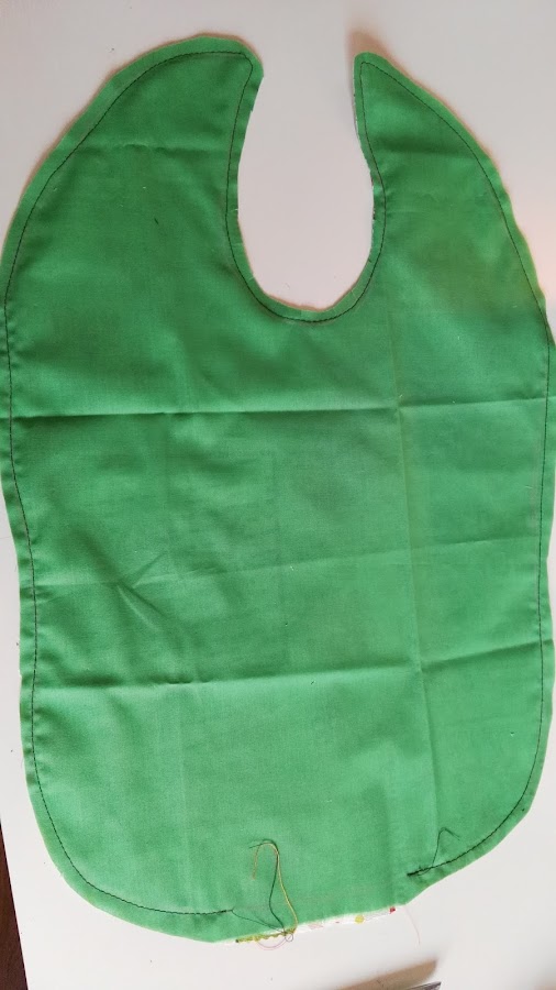 Coseremos todo alrededor, asegurándonos que cosemos las tres capas, excepto un trozo en la parte de abajo, que es por donde daremos la vuelta al babero.