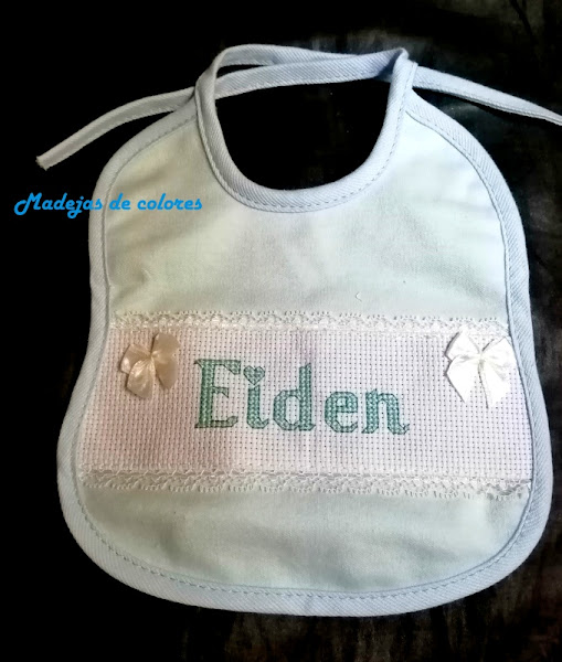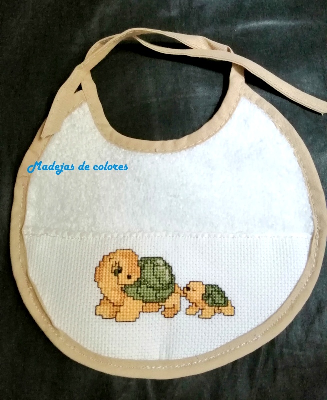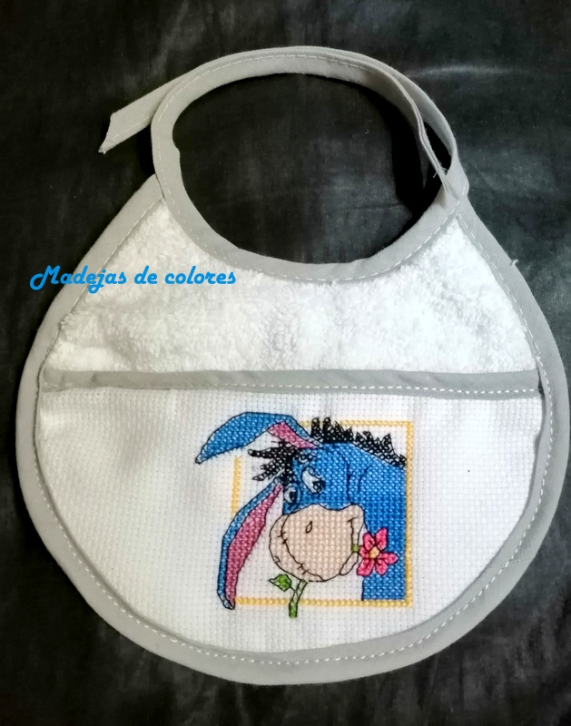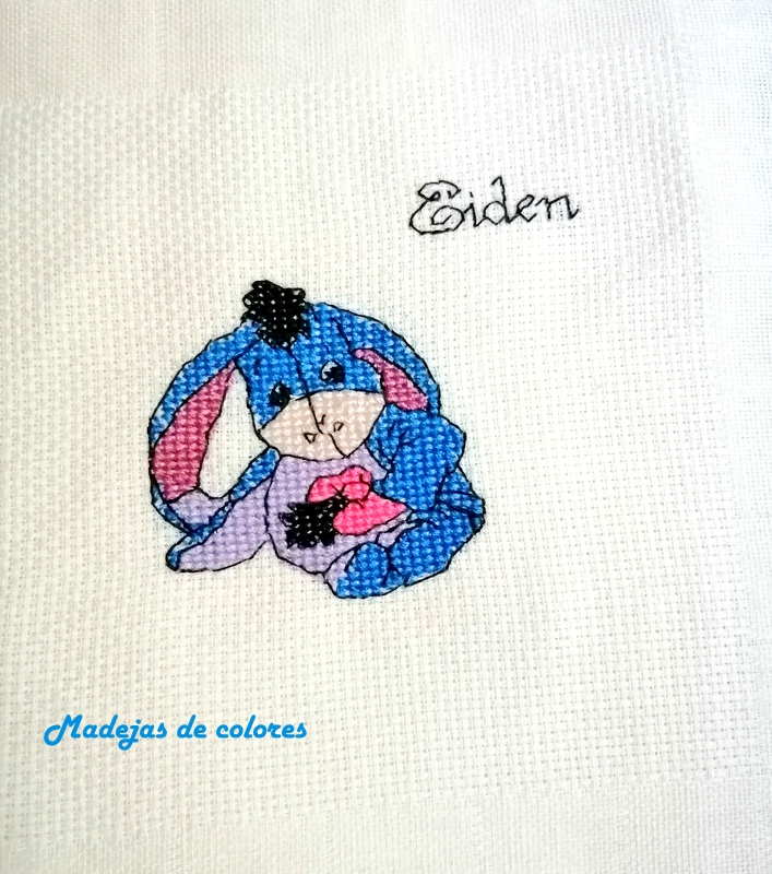 Y por último el pañal, que viene en un extremo con tela aida para poder bordar a punto de cruz, con Igor también y a un lado en punto lineal, el nombre del niño.
