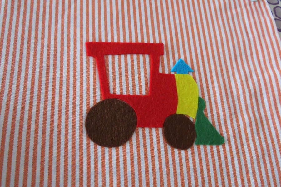 El siguiente paso es planchar las diferentes piezas sobre tela o fieltro, en este caso yo usé una tela naranja que venía (un recuadro pequeño, no sé para que sería)con el babi y era del mismo color que el cuello y el tren de diferentes colores de fieltro.Una vez planchado esperamos a que enfríe la tela y recortamos.Por favor es importante poner un trozo de tela entre la plancha y la fliselina.