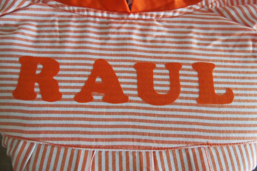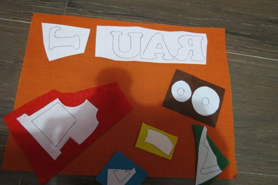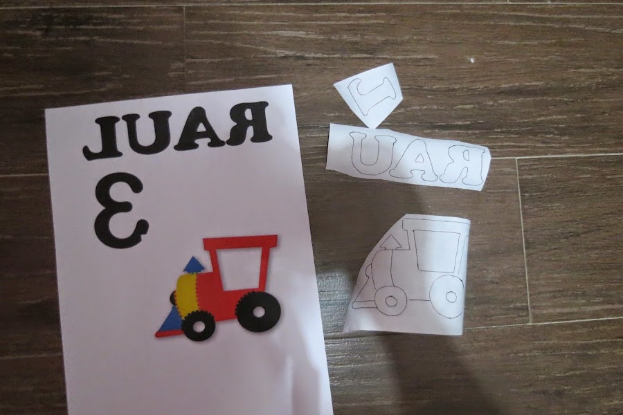Lo que hice fué imprimirme en un folio el nombre de Raúl pero como si estuviera reflejado en un espejo y también el dibujo de un trenecito, que es lo que luego vamos a poner en el babi.
