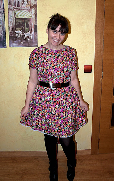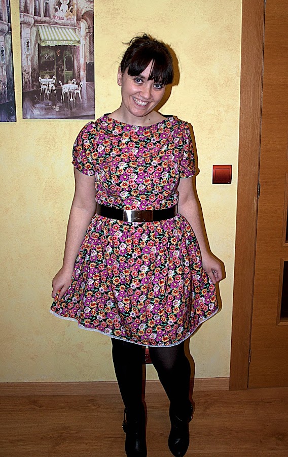 El corte como ya os he comentado es un baby doll, la parte de arriba es justita y de cintura para abajo una falda fruncida y vaporosa. El cuello es barco, la manga es cortita con un botón decorativo. No tenia intención de ponerle forro pero al probármelo se me pegaba a las piernas y quedaba horrible así que lo solucione forrando la falda.