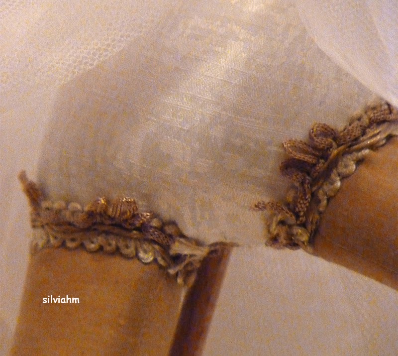 Es una de las más complicadas de hacer. La pierna en alto no lleva ningún soporte `por dentro para ayudar a mantenerla. Hay que rellenarla muy bien para que no quede ni un bulto y coserla teniéndola"en el aire". Pero el resultado es divino.Las telas, muy sencillas, un adamascado blanco, tul y detalles en color champang para rematar escote y piernas.