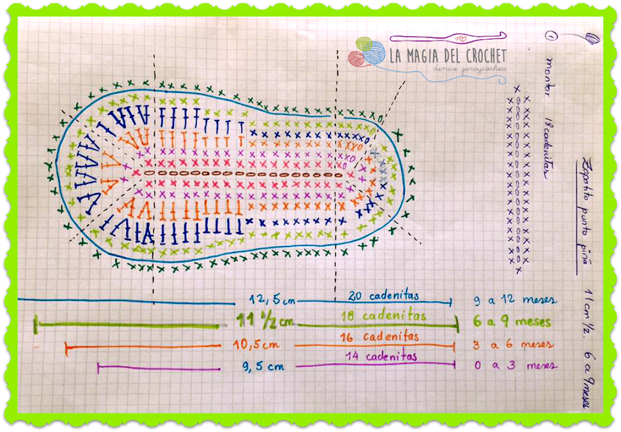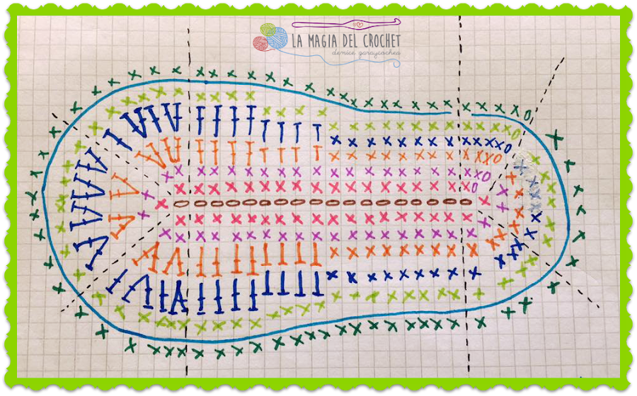 Puedes apreciar en la siguiente foto el esquema de la plantilla del zapato, cada color representa cada una de las filas que vamos a tejer, cada punto está señalado por sus respectivos símbolos, si no te queda claro de cómo hacer cada punto o eres principiante, te sugiero de hacer click en este link: Crochet para principiantes allí encontrarás los datos que necesitas para comprender la simbología del crochet. Lo que olvidé de mencionar en el vídeos es que para una plantilla ´mas grande respecto a esta, por ejemplo para un bebé de 6 a 9 meses ó de 9 a 12 meses, a este esquema tendrías que aumentarle una fila mas similar a la que hicimos en la fila cuatro.