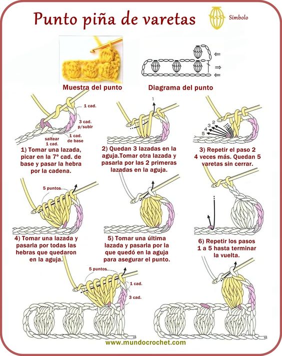 En esta foto puedes apreciar cómo se realiza el Punto Piña, pero en la foto nos muestran la piña de la segunda fila hecha encima de la piña de la primera fila, la que yo he hecho esta realizada en el espacio que se forma entre piña y piña.