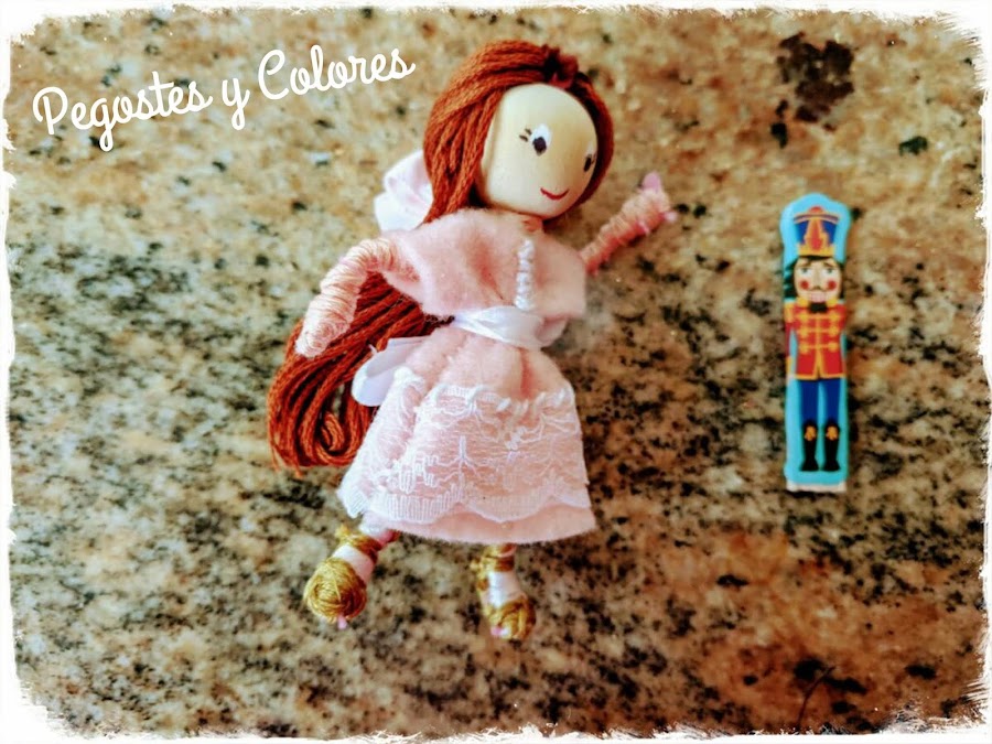 4.- Para Clara use el mismo patrón del vestido de la Gorjuss en version Bendy Doll, mas aparte corte un palito de madera de esos de las paletas heladas y le pegue una pegatina de cascanueces y le di una capa protectora de mod podge.